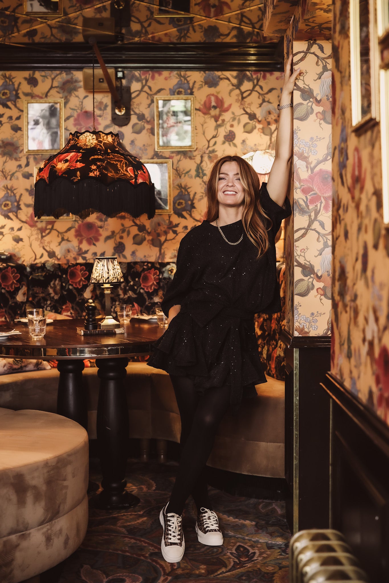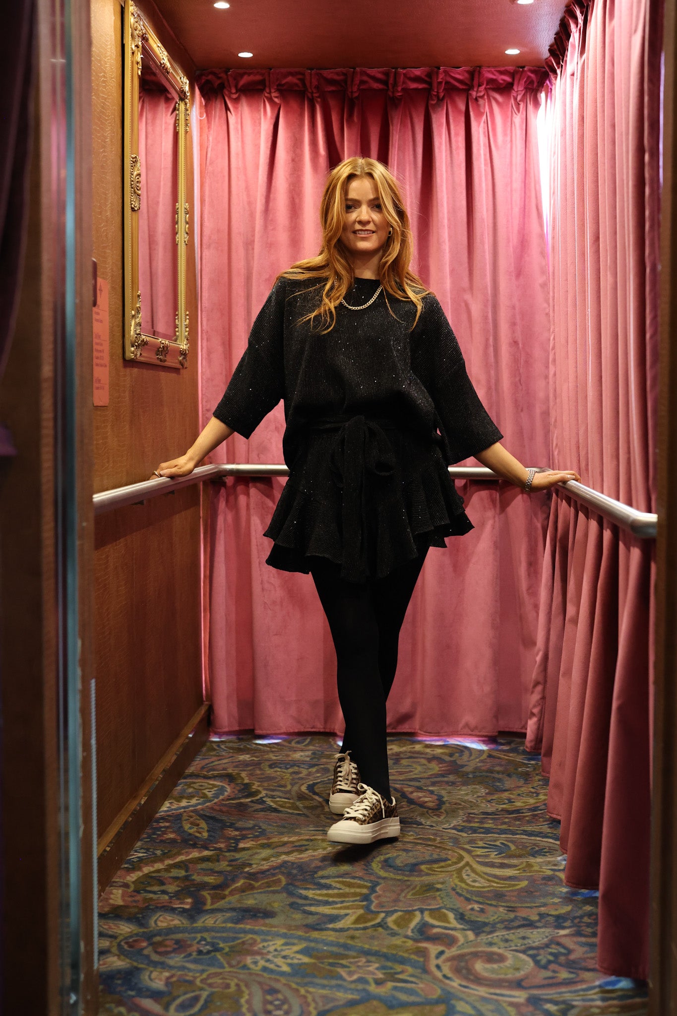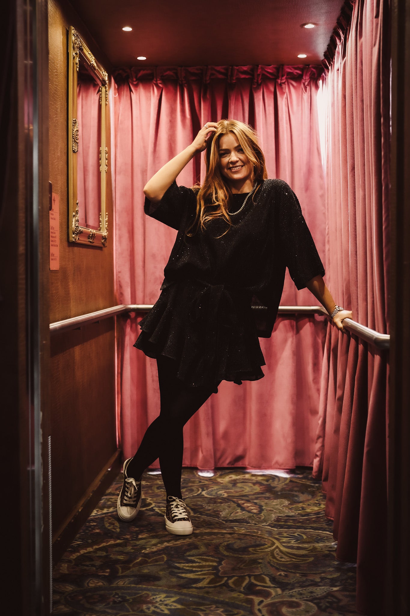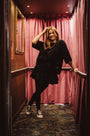 Henni is wearing size small, and it is true to size.