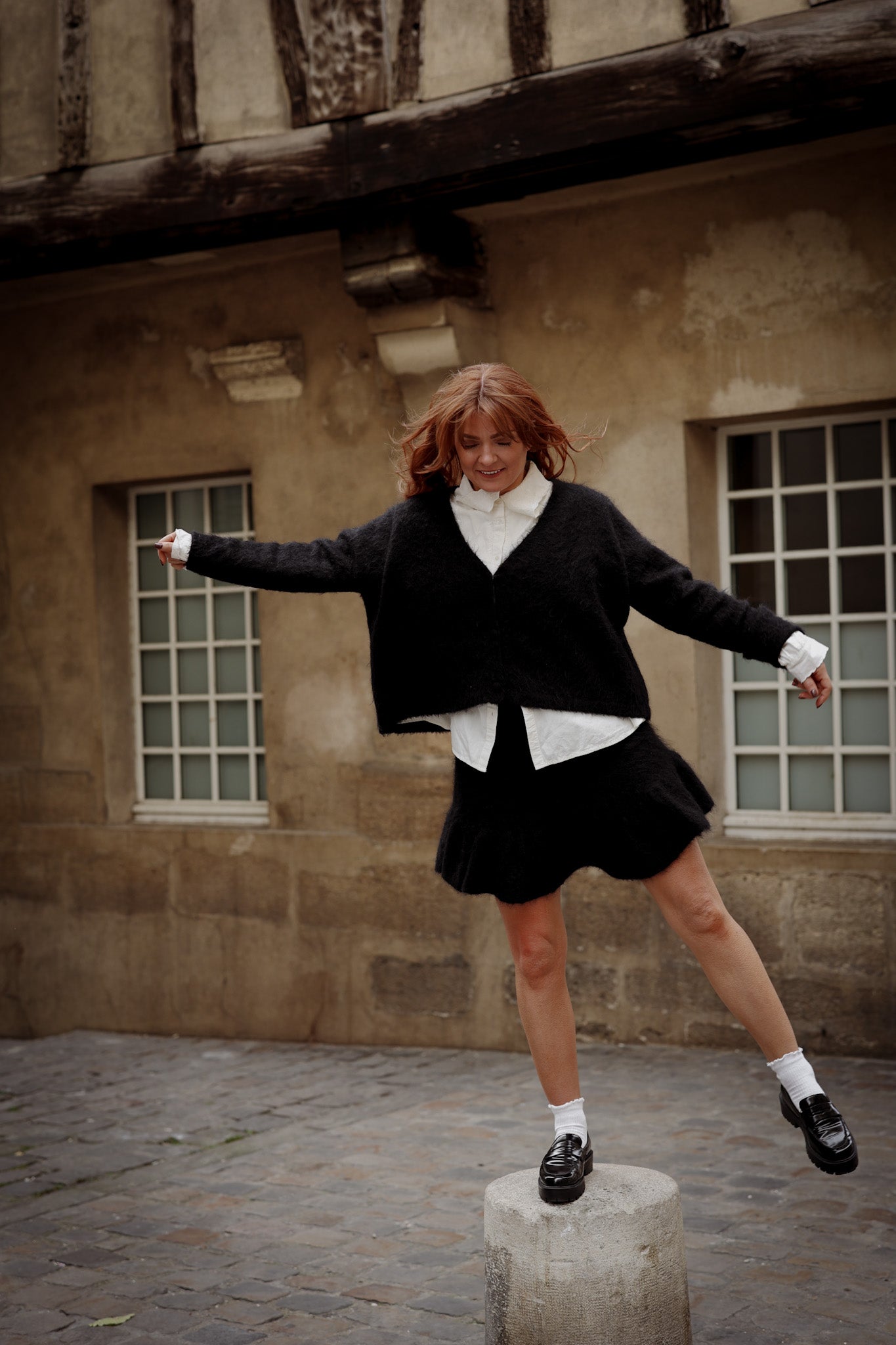 Playful & cozy, the knit frill skirt is the perfect balance of comfort and charm. Soft knit quality with a flattering elastic waist, perfect edgy length and a feminine twist with its delicate frill hem. Pair it with our Boxy Cardi or turtle sweater for a coordinated look or dress it up for an evening out.