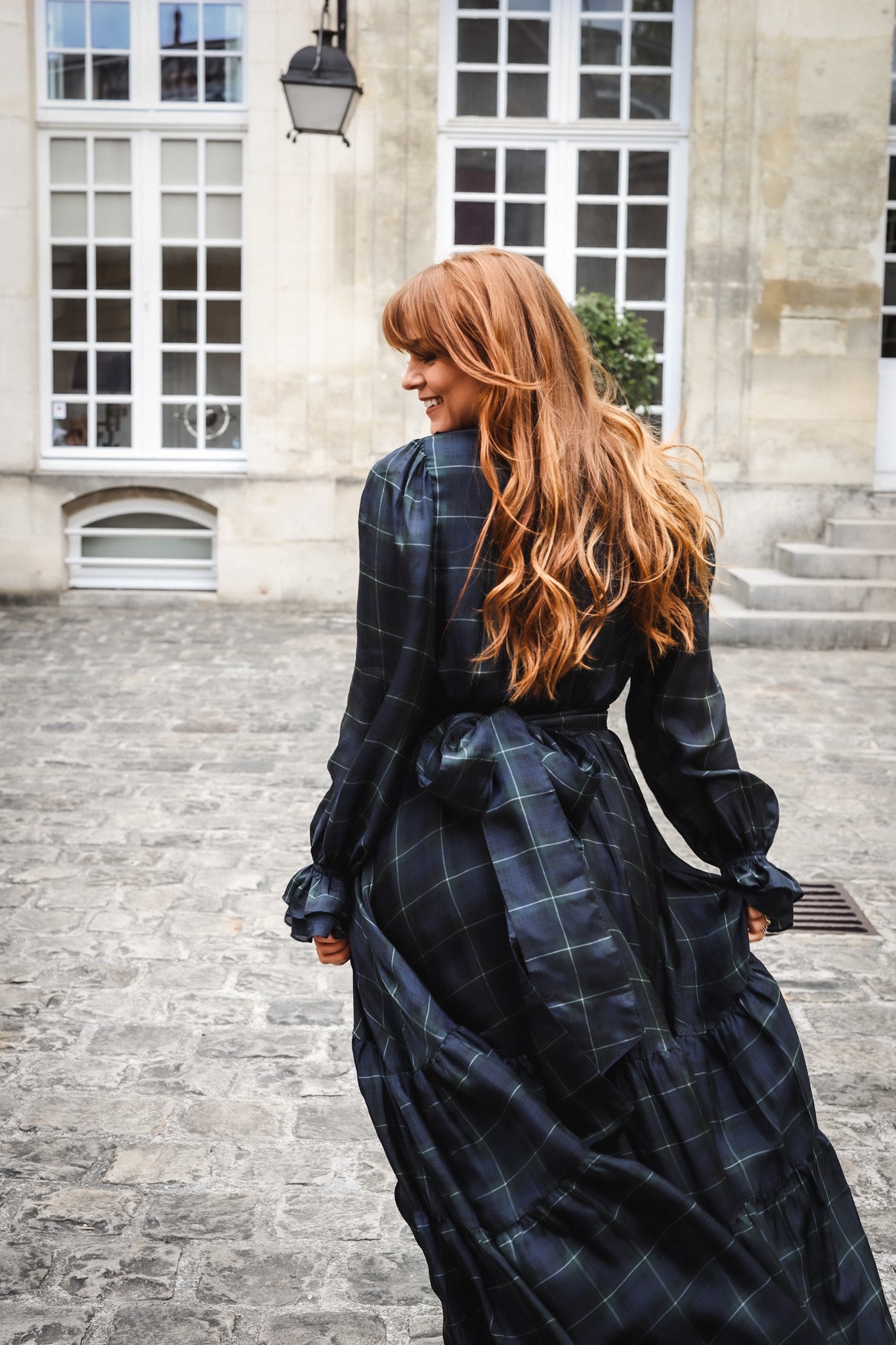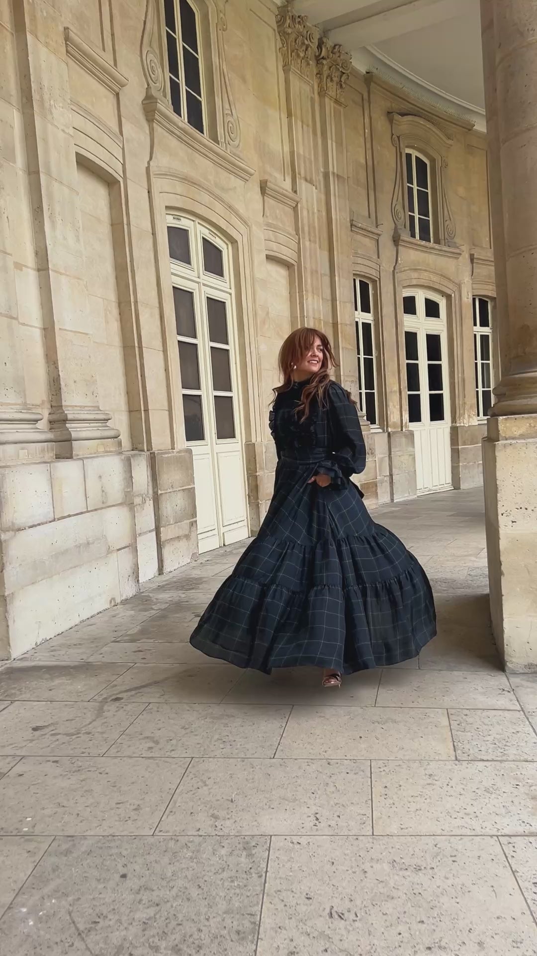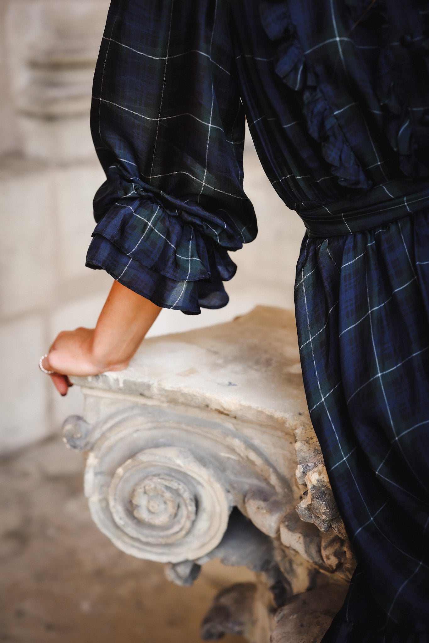 A forever piece. Crafted in luxurious paper cupro viscose with the softness and flow of silk, this show-stopping dress is designed to move with effortless elegance. The timeless check print is elevated with delicate frill details on the sleeves and upper body, while buttons down the front let you create your own V-neckline. The elastic waist and detachable belt ensure a flattering fit, and hidden pockets add a touch of everyday practicality. Rich, refined, and endlessly versatile, this dress is the heart of the Éternelle collection, created to be treasured season after season.