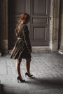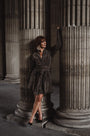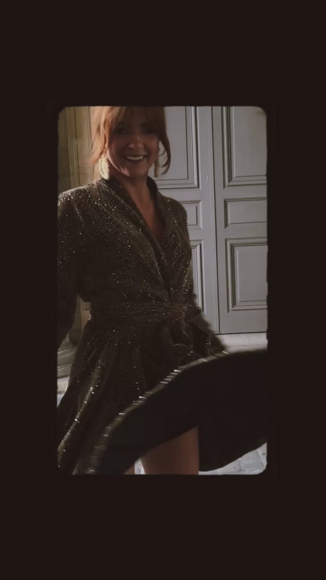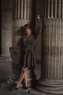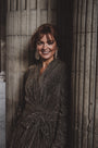 The ultimate party dress - elegant, comfortable, and sparkling like stardust in the night. Crafted in a luxurious black and gold base with silver sparkles that shimmer at every angle, this dress is made to stand out. Designed with a flattering elastic quality with extra elastic at waist, feminine details of gathers at the sleeves, and an overlap V-neckline for the perfect fit. A detachable belt cinches the waist and adds definition, while the flowing frill hem brings playful movement. Glamorous yet easy to wear, a timeless piece for every celebration.